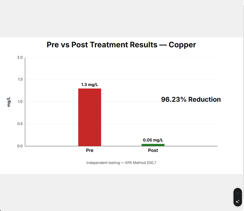 | Copper | 1.3 mg/L | 0.05 mg/L | 96.2%% | EPA 200.7 |