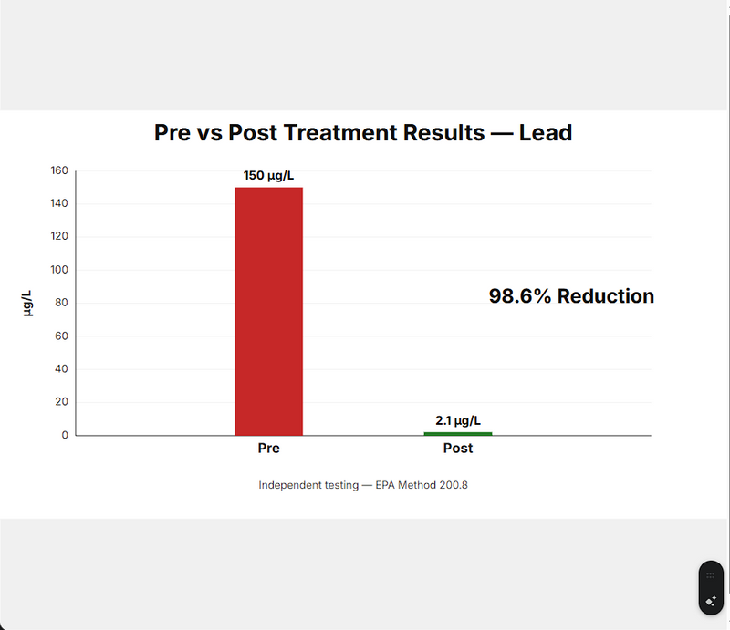| Lead | 150 μg/L | 2.1 μg/L | 98.6% | EPA 200.8 |
