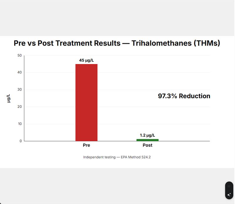| Trihalomethanes (THMs) | 45 µg/L | 1.2 µg/L | 97.3%% | EPA 524.2 |