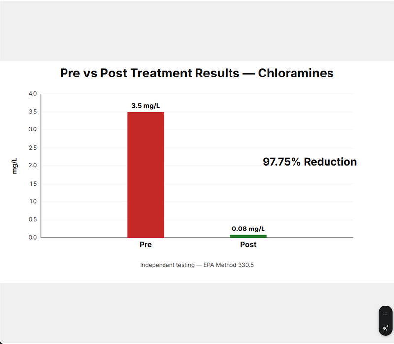 | Chloramines | 3.5 mg/L | 0.08 mg/L | 97.7%% | EPA 330.5 |